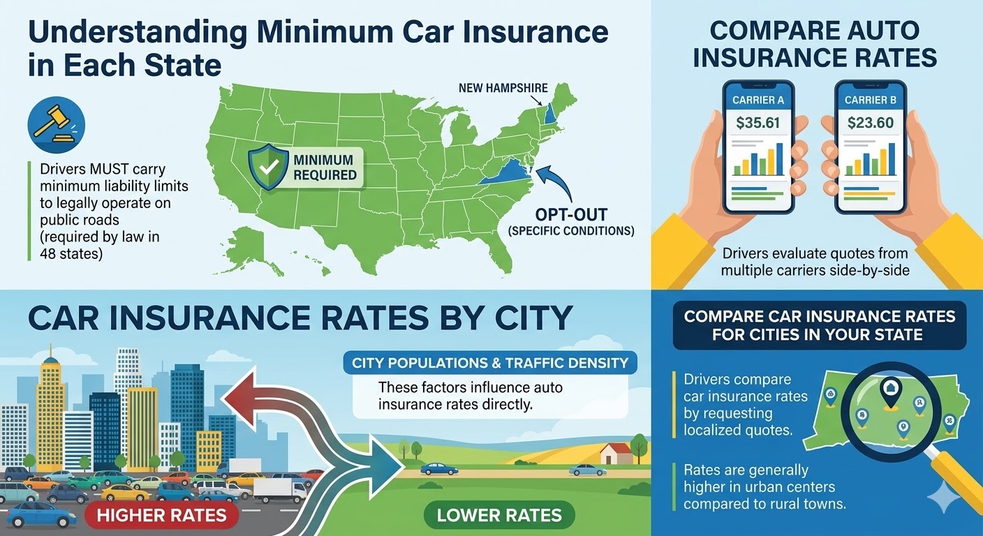 The 4 main components of a Florida car insurance policy include property damage liability, personal injury protection, comprehensive coverage, and collision coverage. This guide compares auto insurance rates by state for March 2026, explains minimum car insurance in each state, and details how to find cheap car insurance in Jacksonville, FL.